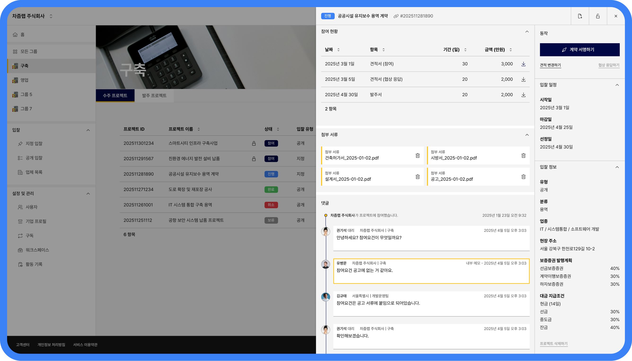 워크스페이스 내에서 논의된 내용을 바탕으로 파트너사와 간편하게 계약을 체결하고, 프로젝트의 진행 상황을 지속적으로 관리할 수 있습니다.